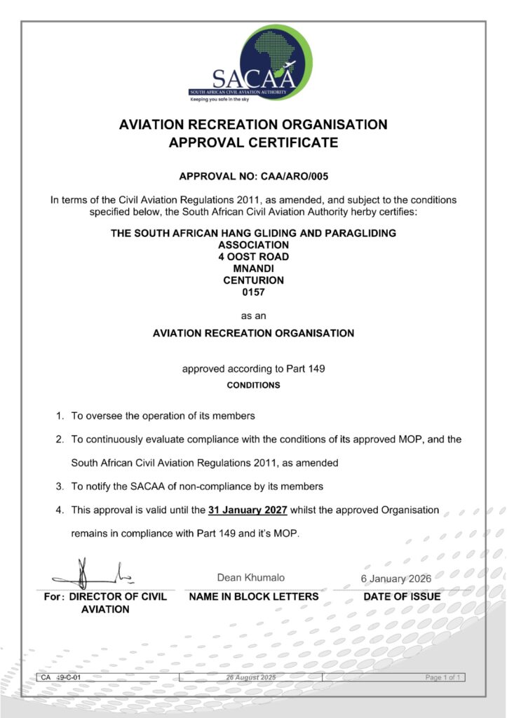 SAHPA is approved by SACAA as an Aviation Recreation Organisation (ARO) with the following: